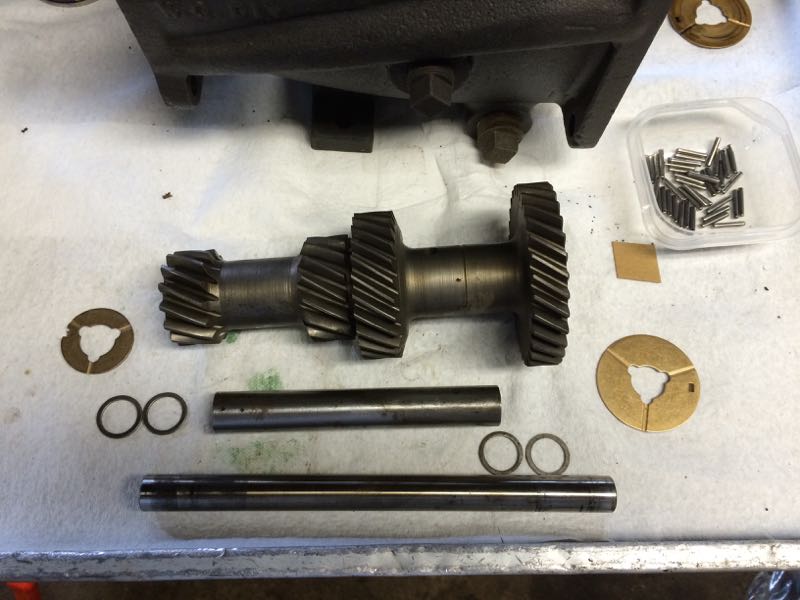 Counter shaft gear and pieces. Shaft, Spacer tube, 4 bearing washers, a small end washer, one large end washer, 20 roller bearings