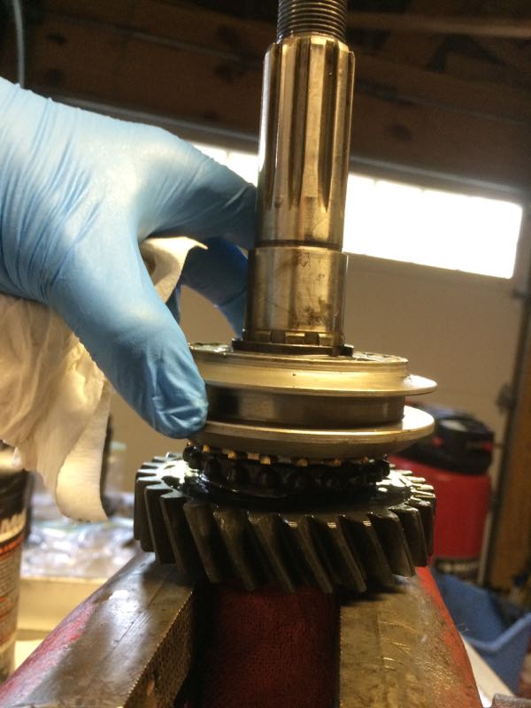 Put the main shaft in a vice to hold it in place. Install the low gear, the brass syncro gear, and the selector. (note the direction of the selector). Install the locking ring.