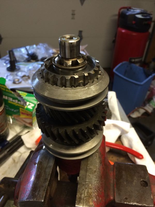 Flip the main shaft over, install 2nd gear, the brass syncro, the selector, and the snap ring.