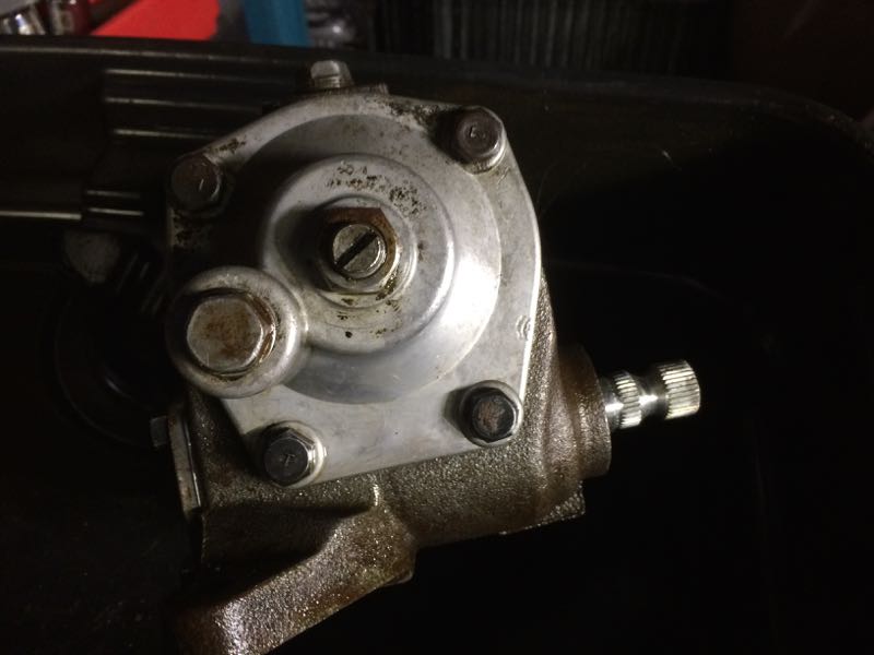 Steering arm/output shaft cover (4 bolts to remove) (large bolt is the fill level/drain hold) (center bolt/hex nut is the output shaft retainer)